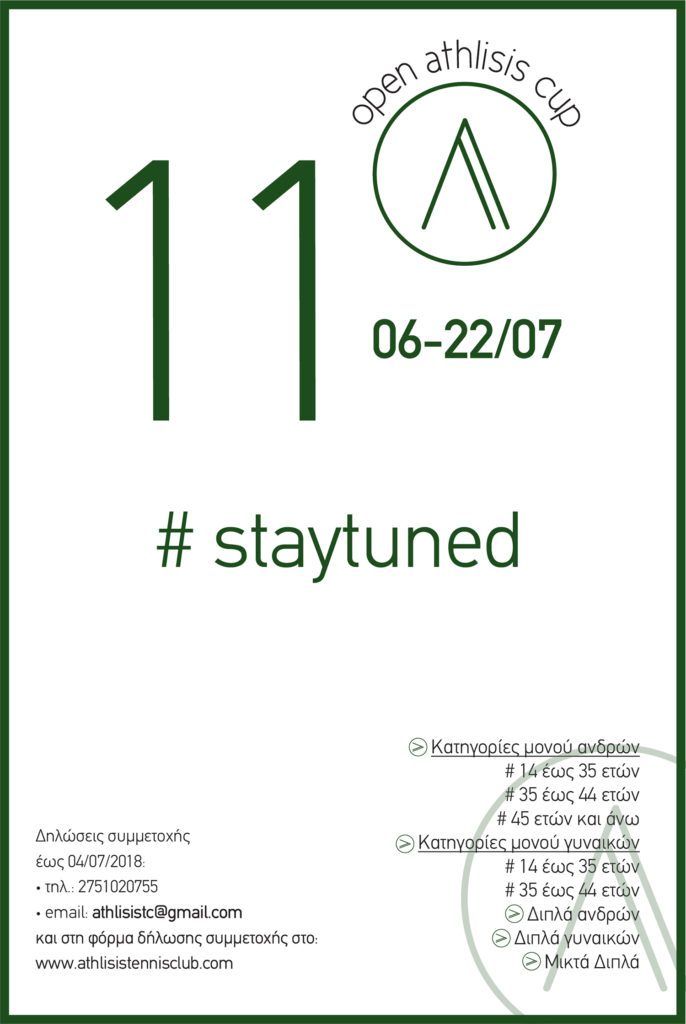 Το Athlisis Tennis Club και ο «ΡΗΓΑΣ» – Αθλητικός Όμιλος Αντισφαίρισης Αργολίδας προκηρύσσουν το 11ο Open Athlisis Cup Ανδρών και Γυναικών που θα διεξαχθεί στις εγκαταστάσεις του Athlisis Tennis Club ( 3o χλμ Άργους-Ναυπλίου, Δαλαμανάρα ). Το 11ο Open Athlisis Cup 2018 αποτελεί ένα από τα 4 τουρνουά της σειράς Peloponnesus Tennis Masters Series.